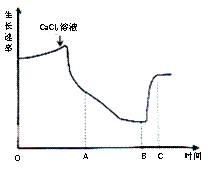(3)赤霉素促进茎的伸长主要与细胞壁的伸展性有关。有人进行了CaCl2和赤霉素对某植物种子胚轴生长速率影响的实验,结果如右图所示。由图分析可知,一定浓度的CaCl2溶液对细胞壁的伸展起 作用;加入赤霉素溶液的时间在图中的 (A点、B点、C点)。根据上述实验分析赤霉素促进茎伸长的可能原因是 。