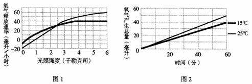 B.图2表明25℃条件下,光合作用每小时所产生的氧气总量比15℃时多10毫升