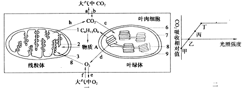 (1)在图二乙点所处的状态时,叶绿体内ATP移动的方向是__________(2)在图二甲状态时,可以发生图一中的哪些过程?(用图中字母表示)___图二中乙-丙段时,限制光合作用的主要因素是______(3)图一中的物质A是_______,物质A进入线粒体的条件是_______