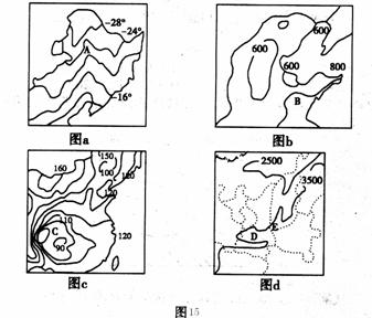 图15是我国部分地区的等值线图,读图回答。(10分)