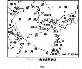 28.读唐代中日的海上交通图(图16),结合所学知识回答下列问题。(10分)