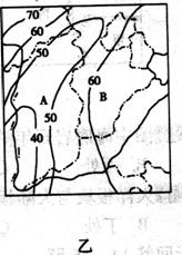 (3) 乙图中A、B两地数值差异较大的原因是什么?(2分)