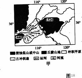 30.读“我国华北部分地区地貌类型示意图”(如图18甲所示)及“华北部分地区河川夏季平均径流量占年平均径流量百分比示意图”(如图18乙所示),回答下列问题。