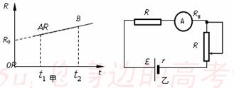 11. 如图甲是某金属材料制成的电阻R随摄氏温度t变化的图象,图中R0表示0℃时的电阻,k表示图线的斜率.若用该电阻与电池(电动势E、内阻r)、电流表A(内阻Rg)、滑动变阻器R′ 串联起来,连接成如图乙所示的电路,用该电阻做测温探头,把电流表的电流刻度改为相应的温度刻度,就得到了一个简单的“金属电阻温度计”.使用“金属电阻温度计”前,先要把电流表的刻度值改为相应的温度刻度值,若温度t1<t2,则t1的刻度应在t2的 侧(填“左”或“右”);在标识“金属电阻温度计”的温度刻度时,需要弄清所测温度和电流的对应关系.请用E、R0、k等物理量表示所测温度t与电流I的关系式t= 。