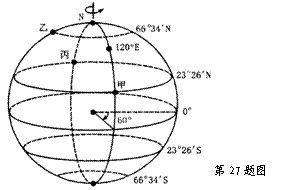 27.读下图,当太阳直射甲点时,回答下列问题。(8分)