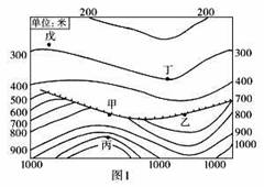 1、甲、乙、丙、丁四地最可能形成瀑布的是