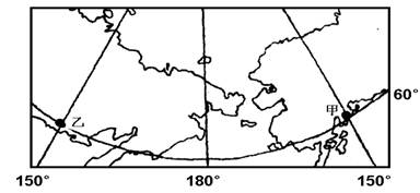 读某区域图,一架飞机在当地时间1时30分从甲地起飞时,太阳正好在地平线上。朝正西飞行,到达乙地时看见太阳在地平线附近,回答32-33题。
