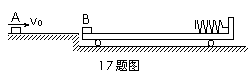 停放着一辆质量M=6.0kg平板车,在车上左端放有一质量mB=4.0kg木块B。车左边紧邻一个与平板车等高的光滑水平面,现有另一质量 mA= 2.0kg的木块A,从左侧光滑水平面上以v0=3.0m/s向右运动,然后与B发生碰撞,设木块A、B碰撞时间很短且为弹性正碰。碰后木块B开始在平板车上滑行,并与固定在平板车上的水平轻质弹簧作用后与弹簧分离,已知木块B把弹簧压缩到最短时距离平板车左侧的距离为L=0.20m,重力加速度为g=10m/s2,木块B与平板车之间的动摩擦因数为μ=0.50。(结果保留两位有效数字)求: