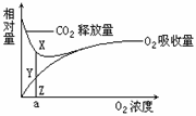 22.下图表示的是某植物的非绿色器官呼吸时O2的吸收量和CO2的释放量之间的相互关系,其中线段XY=YZ。则在氧浓度为a时有氧呼吸与无氧呼吸: ( ) ![]()