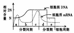 右图表示洋葱根尖细胞有丝分裂各阶段细胞核中DNA和细胞质中mRNA的含量变化。下列有关说法正确的是:( )![]()