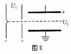 10、如图8所示是从灯丝发出的电子经加速电场加速后,进入偏转电场,若加速电压为U1,偏转电压为U2,要使电子在电场中的偏转量y增大为原来的2倍,在保持其它物理量不变条件下,可供选用的方法有,使( )