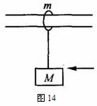 15、(12分)如图14所示,在光滑的水平杆上套者一个质量为m的滑环,滑环上通过一根不可伸缩的轻绳悬吊着质量为M的物体(可视为质点),绳长为L。将滑环固定时,给物块一个水平冲量,物块摆起后轻绳恰好能摆至水平位置,若滑环不固定,仍给物块以同样的水平冲量,求物块摆起的最大高度。