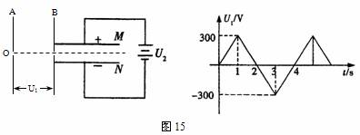 16、(14分)如图15所示,A、B为两块距离很近的平行金属板,板中央均有小孔。一细束电子从A板小孔水平射入A、B之间,电子刚到A板小孔时动能为100 eV,电子束是连续不断地射入的。在B板右侧,平行金属板M、N之间加20 V恒定电压。整个装置在真空中。MN组成的电容器中,板长为4×10-2m,板间距离为8×10-3m。现在A、B两板间加一个交变电压U1,在t=0到t=2 s时间内,A板电势高于B板,则在U1随时间变化的第一个周期内,在哪段时间内电子从偏转电场右侧飞出。(不计电子在AB板间运动的时间)