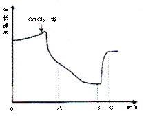 (3)赤霉素促进茎的伸长主要与细胞壁的伸展性有关。有人进行了CaCl2和赤霉素对某植物种子胚轴生长速率影响的实验,结果如右图所示。由图分析可知,一定浓度的CaCl2溶液对细胞壁的伸展起 作用;加入赤霉素溶液的时间在图中的 (A点、B点、C点)。根据上述实验分析赤霉素促进茎伸长的可能原因是 。