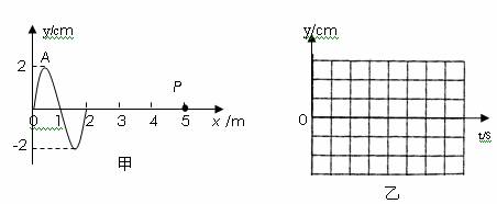 (3)如果以该机械波传到质点p开始计时,请在下图乙中画出p点的振动图像,并标明必要的数字,至少画出一个周期的图像。![]()