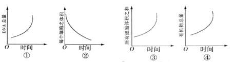 18.(  )下图是表示蛙的受精卵发育至桑椹胚过程中,DNA总量、每个细胞体积、所有细胞体积之和、有机物总量的变化趋势(横坐标为发育时间)。其中正确的是
