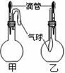 如图所示的甲、乙两个装置中,胶头滴管中吸入某种液体,平底烧瓶中充入(或放入)另一种物质,挤压胶头滴管加入液体,一段时间后两装置中的气球都有明显地胀大(忽略液体体积对气球的影响)。则所用试剂分别可能依次是 ( )