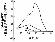 (4分)光合作用受光照强度、CO2浓度、温度等影响,图中4条曲线(a、b、c、d)为不同光照强度和不同CO2浓度下,马铃薯净光合速率随温度变化的曲线。a光照非常弱,CO2很少(远小于0.03%);b适当遮荫(相当于全光照的1/25)CO2浓度为0.03%,c全光照(晴天不遮荫),CO2浓度为0.03%;d全光照,CO2浓度为1.22%。请据图回答: