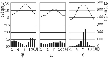 (2)能正确反映C地气候状况的是甲、乙、丙三种气候类型中的___________;在该气候区内,适宜生长的植物有