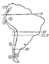 (3)④处终年受西风带影响,地处迎风坡,降水丰富,形成温带落叶阔叶林;⑤处于安第斯山脉的背风坡,降水稀少成为温带荒漠。