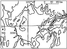 (2)东部等高线密集,说明坡度大;南北数值大,中间数值小,说明南北高、中间低,应是峡谷地形,具体是三峡地区。西部海拔达3000米,应属横断山区。