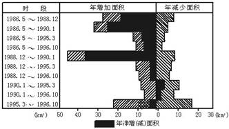 下图反映的是黄河河口地区不同时段在黄河泥沙淤积作用和海洋潮流作用共同影响下,黄河三角洲陆地面积增减的变化情况。据此回答第3题。