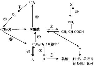(2)A、B属于存在不同组织中的同一类化合物,但是其形成后却有着不同的转化形式,A可以重新形成C6H12O6,B则沿着⑧途径形成乳酸,造成这种差异的根本原因是