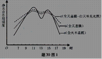I在春末晴朗白天,重庆某蔬菜基地规定了某大棚蔬菜在不同条件下的净光合作用强度(实际光合作用强度与呼吸作用强度之差),结果见题30图l(假设塑料大栅外环境条件相同;植株大小一致、生长正常,栽培管理条件相同)