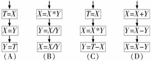 9.在程序中需要将两个变量的值交换,以下四个流程图中,不能完成将非零变量X、Y的值互换的是( )