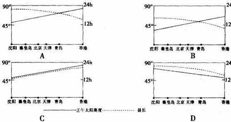 7.下列图中能正确表示第29届奥运会举办期间某一天部分赛场城市正午太阳高度与昼长变化的是