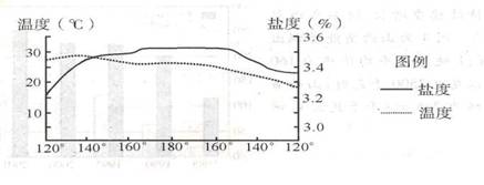 26.图中显示盐度最低处位于①1200E ②1200W ③亚欧大陆西岸 ④太平洋西岸中的