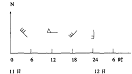 我国是世界上受台风影响最大的国家之一,下图是我国沿海某城市在一次台风天气过程中的风向和风力变化图。风杆(长线段)上绘有风尾(短线段)的一方指示风向。每一道风尾表示风力2级,一个风旗表示风力8-12级。读后回答29-30题。