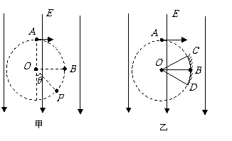 (16分)如图甲所示,在场强大小为E、方向竖直向下的匀强电场内存在一个半径为R的圆形区域,O点为该圆形区域的圆心,A点是圆形区域的最高点,B点是圆形区域最右侧的点.在A点由放射源释放出初速度大小不同、方向均垂直于