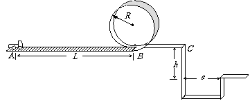 12、(19分)某校物理兴趣小组决定举行遥控赛车比赛。比赛路径如图所示,赛车从起点A出发,沿水平直线轨道运动L后,由B点进入半径为R的光滑竖直圆轨道,离开竖直圆轨道后继续在光滑平直轨道上运动到C点,并能越过壕沟。已知赛车质量m=0.1kg,通电后以额定功率P=1.5W工作,进入竖直轨道前受到阻力恒为0.3N,随后在运动中受到的阻力均可不记。图中L=10.00m,R=0.32m,h=1.25m,s=1.50m。问:要使赛车完成比赛,电动机至少工作多长时间?(取g=10m/s2)