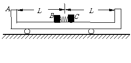 13、(19分)如图所示,内壁光滑的木槽小车质量为mA= m,内直径为2L,置于水平地面上, 小车与地面间的动摩擦因数为μ.车槽内有两个小物块B、C,它们的质量分别是mB = m,mC=2 m .现用两物块将很短的轻弹簧压紧(物块与弹簧不连接),且B物块到车槽左端、C物块到车槽右端的距离均为L,这时弹簧的弹性势能为EP = μmgL.同时释放B、C物块,并假设小物块与车槽碰撞后不分离, 物块B、C的大小、轻弹簧的长度和碰撞时间不计.试求:
