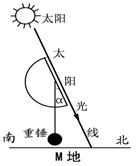 某人在M地用量角器测正午太阳高度。如右图所示,于格林尼治时间17时40分测得∠α的全年最小值为