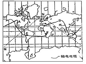 站联成网络(如右图,图中的A、B、C、D、E、F、G、H为世界上一些太阳能资源丰富地区),以便在昼夜半球之间调节太阳能的余缺。读右图后回答以下问题:(11分)