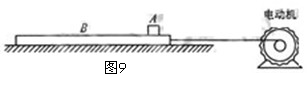 (8分)如图9所示,物体A放在足够长的木板B上,木板B静止于水平面。t=0时,电动机通过水平细绳以恒力F拉木板B,使它做初速度为零,加速度aB=1.0m/s2的匀加速直线运动。已知A的质量mA和B的质量mg均为2.0kg,A、B之间的动摩擦因数μ1=0.05,B与水平面之间的动摩擦因数μ2=0.1,最大静摩擦力与滑动摩擦力大小视为相等,重力加速度g取10m/s2。求