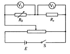 题型6. 右图为一电学实验的实物连线图。 特测电阻Rx的阻值(约500Ω)。图中两个电压表量程相同,内阻都很大。实验步骤如下: