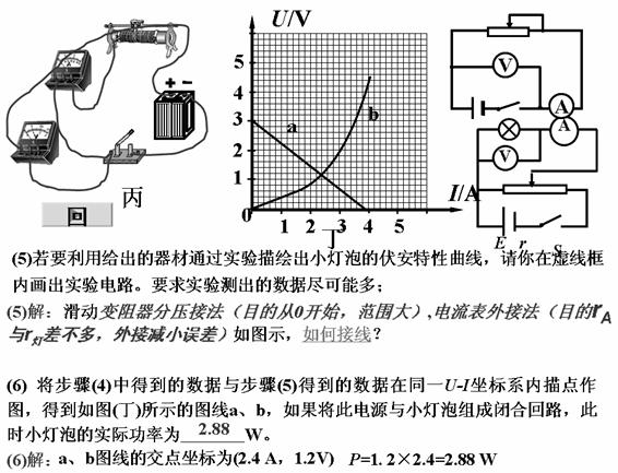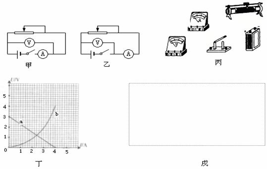 (6) 将步骤(4)中得到的数据与步骤(5)得到的数据在同一U-I坐标系内描点作图,得到如图 (丁)所示的图线a、b,如果将此电源与小灯泡组成闭合回路,此时小灯泡的实际功率为 。