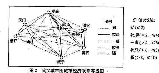 根据表3中仙桃与武汉的雅,计算两市的经济联系等级值C为 ,并根据图2中的图例,在两市间画出相应的线段。