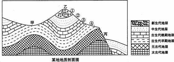 1.地质剖面图上,甲、乙、丙三处的地质构造分别是 、 、 。图中,陡崖出现在 处。甲处成为谷地的主要原因是: 。