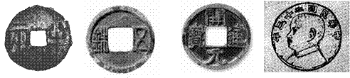 ①秦半两钱 ②隋五铢钱 ③开元通宝 ④民国银元