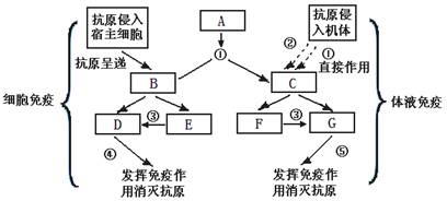 51.(12分)右图是人体特异性免疫的过程示意图(图中序号表示过程,英文字母表示细胞),请回答:
