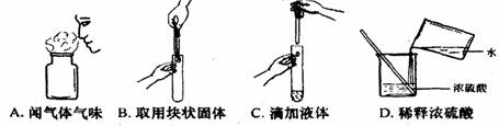 [解析]不能直接闻药品的味道,取用块状固体时,先要把试管横放,放在固体打碎试管底部,稀释浓硫酸时,应把浓硫酸往水里倒。![]()