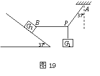 21.(10分)所受重力G1=8 N的砝码悬挂在绳PA和PB的结点上。PA偏离竖直方向37°角,PB在水平方向,且连在所受重力为G2=100 N的木块上,木块静止于倾角为37°的斜面上,如图19 ,试求:木块与斜面间的摩擦力和木块所受斜面的弹力。