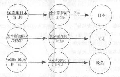 6.读我国东部沿海地区三家境外投资建厂的原料地、配件供应地和产品市场示意图。图示