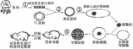 2008年诺贝尔化学奖授予了三位在研究绿色荧光蛋白(GFP)方面做出突出贡献的科学家。绿色荧光蛋白能在蓝光或紫外光的激发下发出荧光,这样借助GFP发出的荧光就可以跟踪蛋白质在细胞内部的移动情况,帮助推断蛋白质的功能。下图为我同首例绿色荧光蛋白(GFP)转基因克隆猪的培育过程示意图,据图回答: