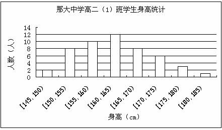 7、我们对那大中学高二(1)班50名学生的身高进行了调查,按区间145--150,150--155,…,180-185(单位:cm)进行分组,得到的分布情况如下图所示,由图可知样本身高在165--170的频率为( )