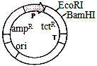 (12分)右下图为某种质粒表达载体简图,小箭头所指分别为限制性内切酶EcoRI、BamHI的酶切位点,ampR为青霉素抗性基因,tctR 为四环素抗性基因,P为启动子,T为终止子,ori为复制原点。已知目的基因的两端分别有包括EcoRI、BamHI在内的多种酶的酶切位点。据图回答下列问题: